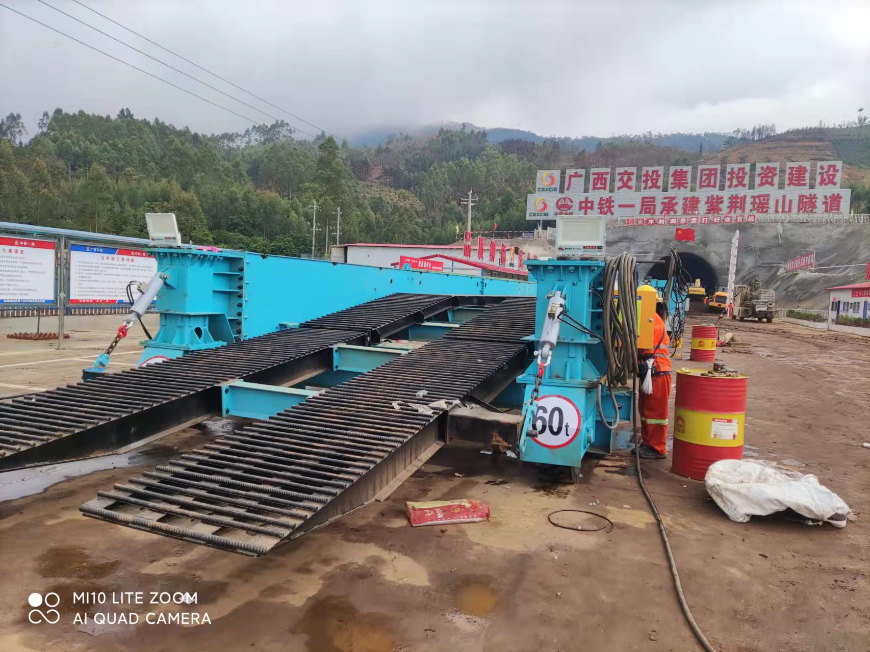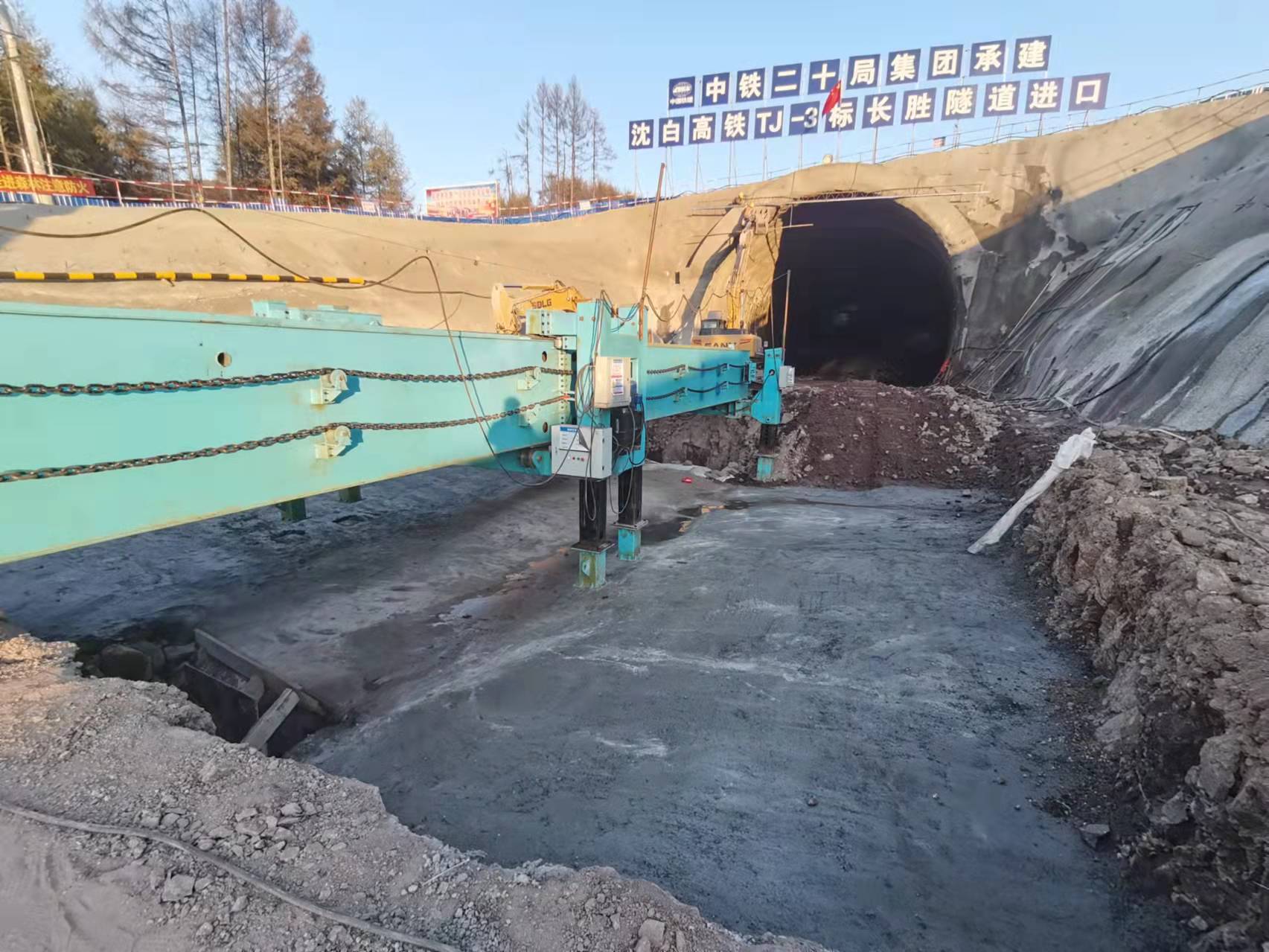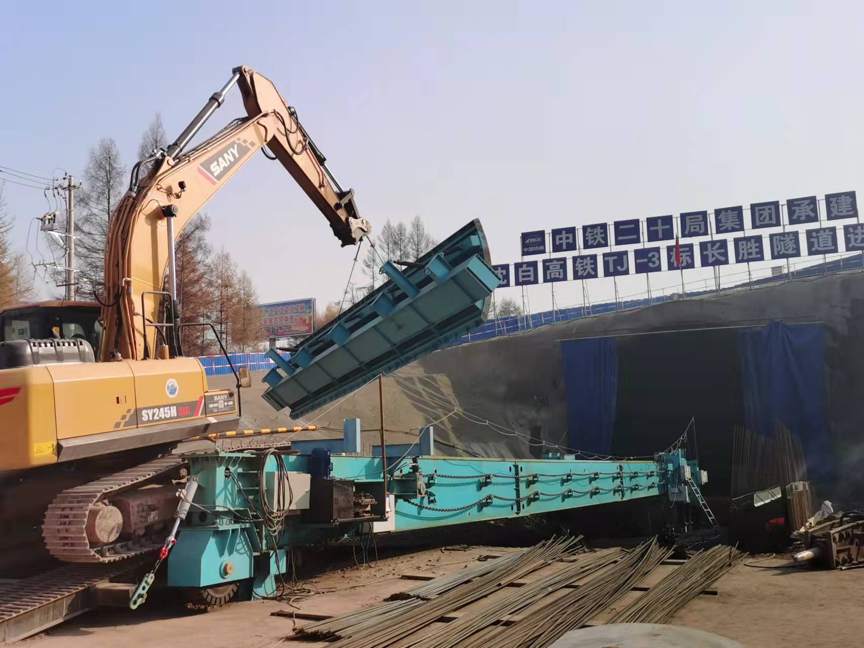 襯砌開始,臺車就位、模板定位完成,模板頂升機構將臺車頂起,左右平移機構將臺車模板調節至隧道中心,收立模機構撐起兩邊側模,臺車兩端封閉,開始混凝土澆筑襯砌。